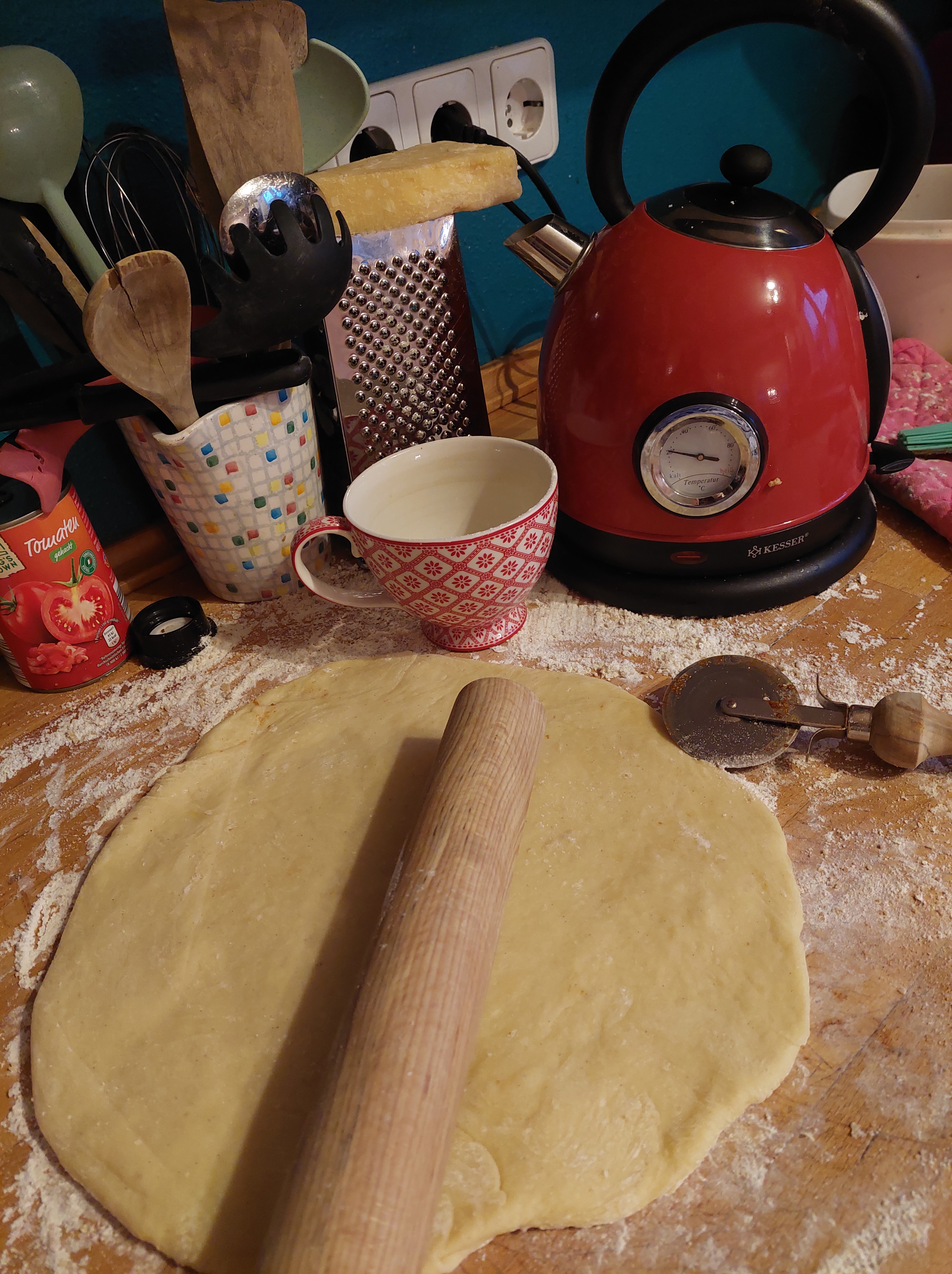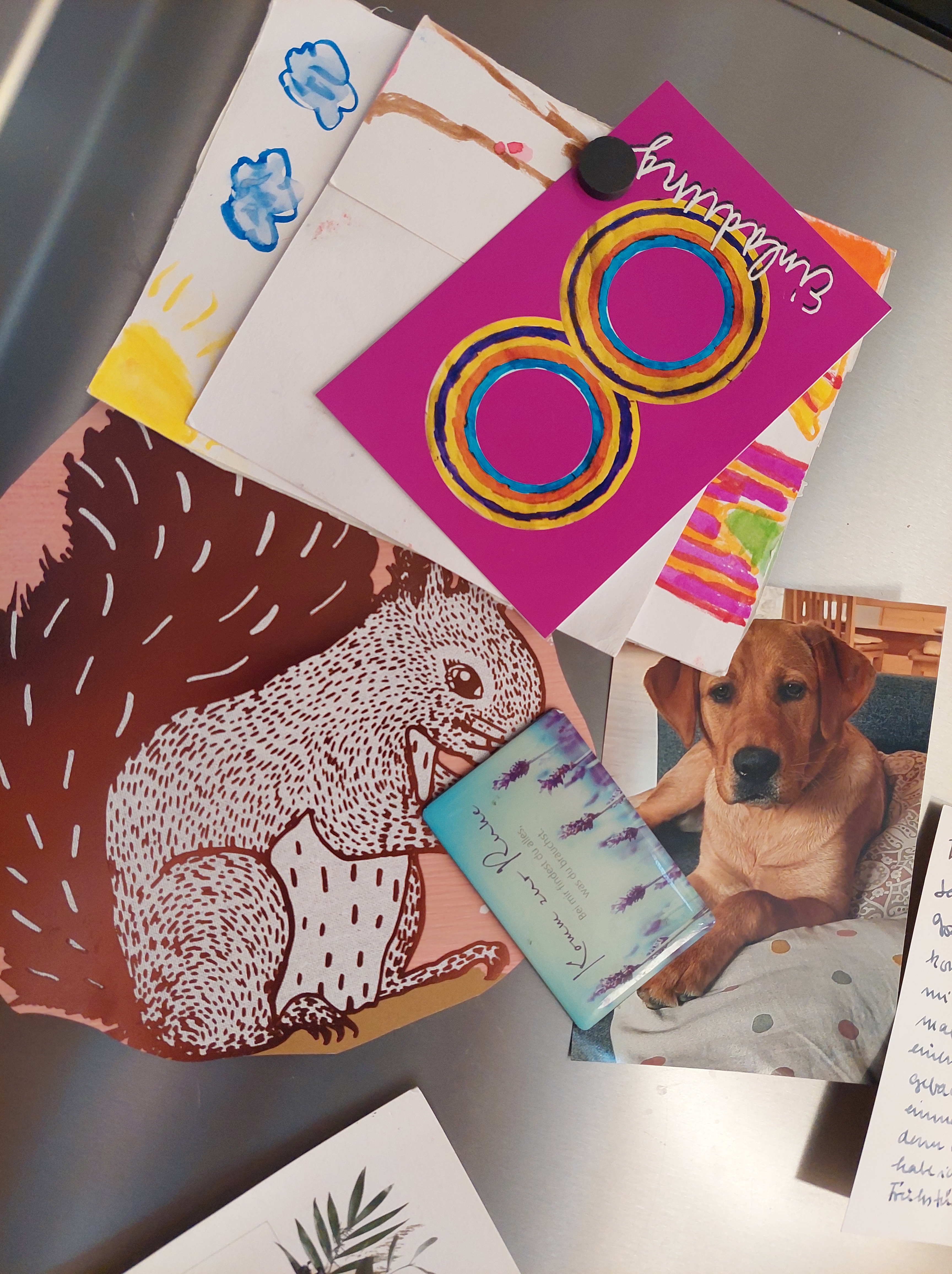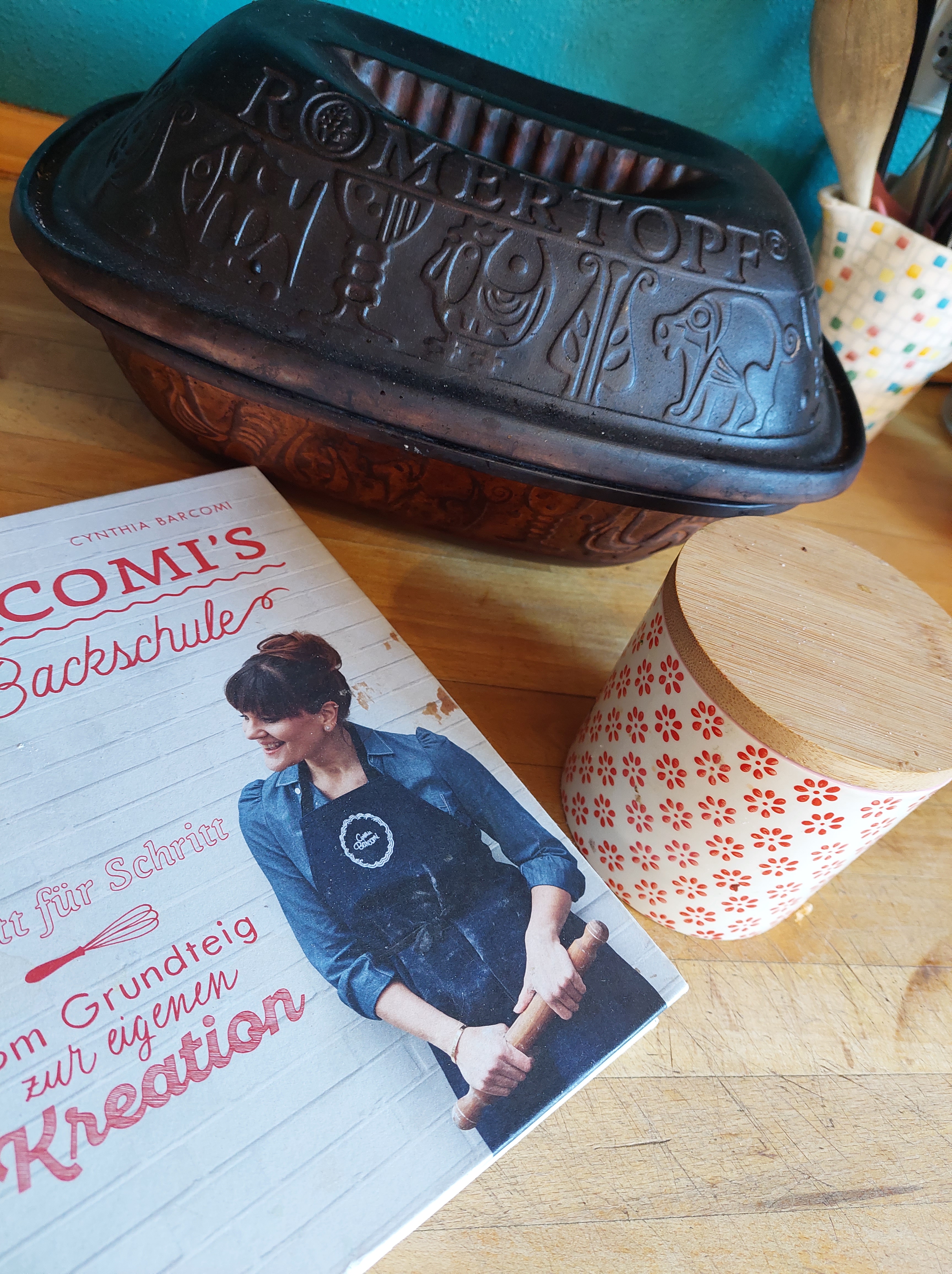 Stattdessen könntest du eine Weile rein kommen, auf eine Teelänge oder zwei. Du würdest mitten hineinkommen in unseren strubbeligen Alltag und in der Küche stehen, während ich das Wasser aufsetze und weil du freundlich bist, würdest du großzügig über das ein oder andere Chaos hinwegsehen. Dein Blick fiele auf das Backbuch, welches quasi auf der Arbeitsplatte festgewachsen ist, seit Wochen schon, fast täglich im Gebrauch. Es gehört gar nicht mir sondern meinem großen Mädchen. Aber ich liebe es und hat schon so manche trübe Winterstunde gemütlich gemacht. Apfel-Buttermilch- Muffins könnte ich dir empfehlen. Oder die Mohnbrötchen zum Abendbrot. Das beste Cookies-Grundrezept und dann kippst du alles dran, was du noch so im Hause hast. Du würdest den alten, verschrappten Römertopf sehen, indem ich jeden zweiten Tag unser Brot backe und wir würden uns ein wenig austauschen, wie tröstlich und heilsam gewöhnliche und unaufgeregte Alltagshandgriffe sind. Du würdest lächeln, beim Anblick des Kühlschrankes, der voll hängt mit selbstgemalten Schätzen und Einladungskarten und klugen Worten, die ich nicht vergessen will. Denn du hast selbst so einen Kühlschrank oder eine Pinnwand und du weißt, wieviel Familienseele da dran hängt.