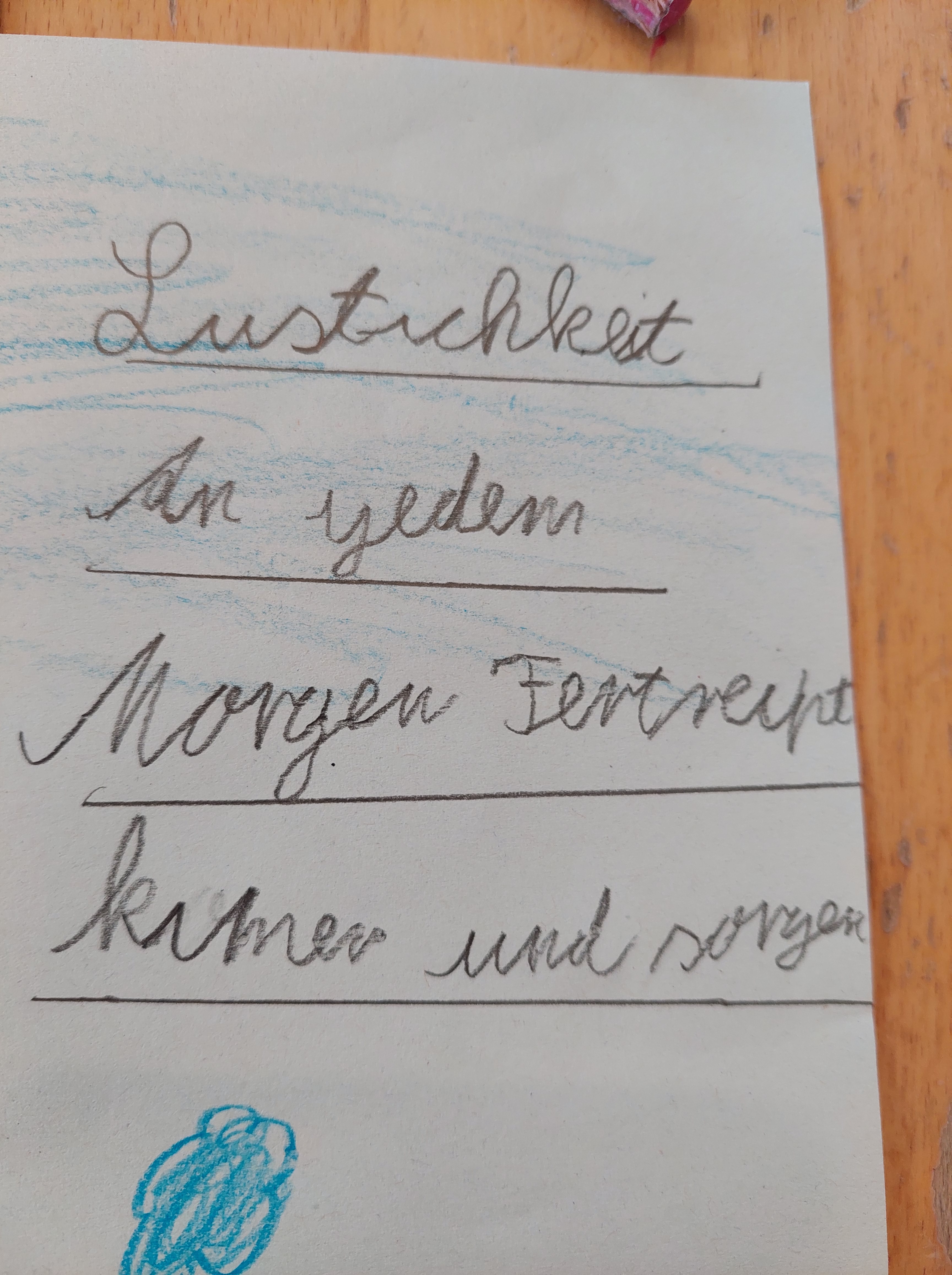 Auf dem Tisch liegen natürlich jede Menge Dinge, die uns beschäftigen, entschuldige bitte, störe dich nicht dran. Ein neues Kartenspiel, das uns Sonntags in Wallung bringt. Zirkelübungen für Kreisbilder, Timm Taler und mehrere dazugehörige Arbeitsblätter, die chemische Zusammensetzung von Ahoibrause. Der Einwahlzettel für die Leistungskurse unseres Ältesten. Einen Moment würde mir die Stimme stocken, denn weißt du, würde ich leise sagen, es ist so unglaublich wunderbar, wenn kleine Menschen groß werden, aber es sorgt auch für dieses schmerzhafte Ziehen in der Herzgegend, weil die Zeit niemals still steht, nicht eine Sekunde lang, und ich diesen großen Kerl so sehr mag. Meine Kinder werden älter und gerade spüre ich die Veränderung überdeutlich. Eines irrt jede Nacht durchs Haus, gefangen in Alpträumen, wie immer wenn es sich verändert, seit Babytagen schon. Eines hat alle Kinderbücher aussortiert. Eines schläft jetzt am Abend bei geschlossener Türe ein. Wahrscheinlich würdest du nicken und leise seufzen: Ich weiß.