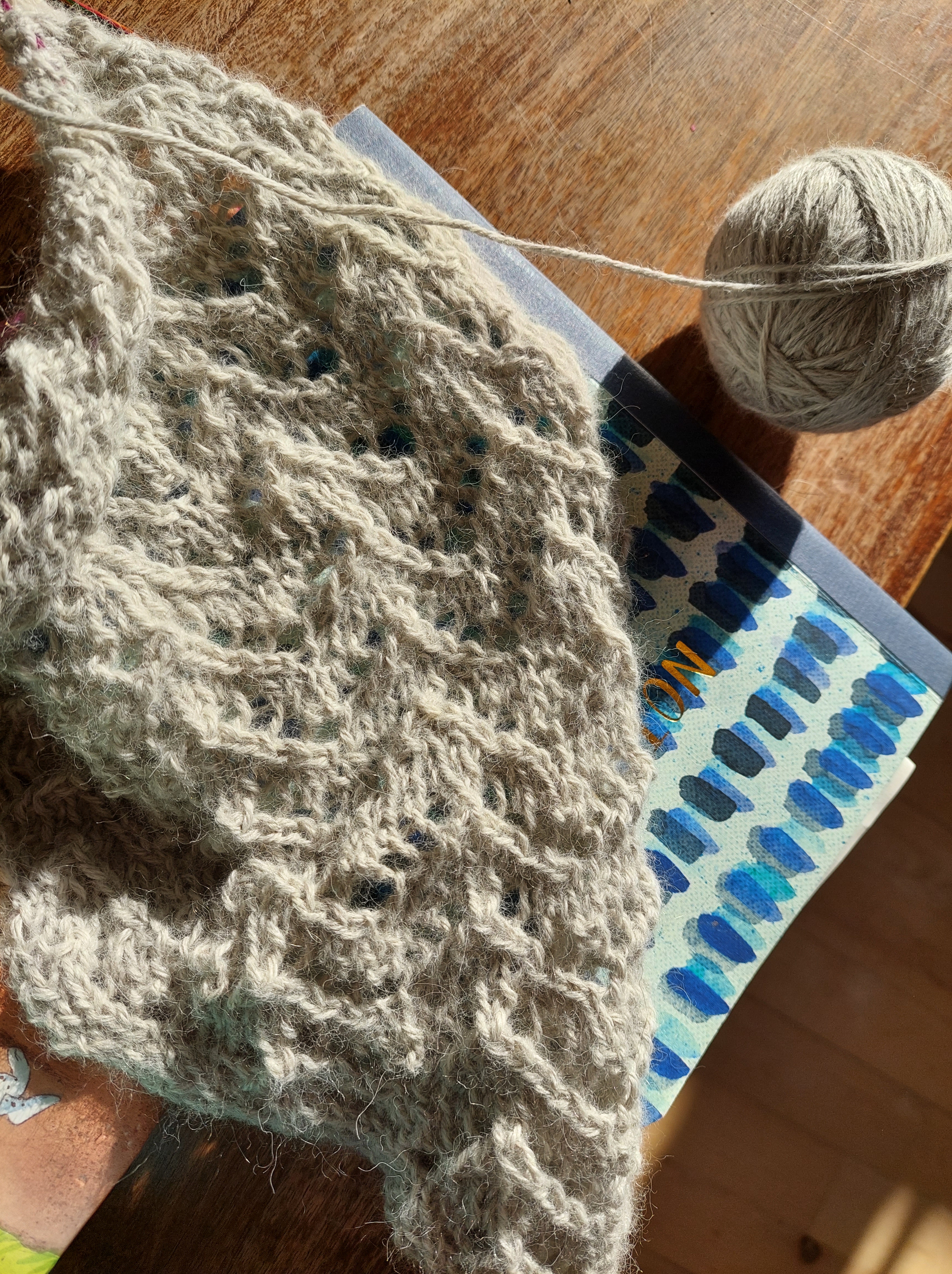 Ein Tuch wird es werden, erzähle ich dir dann, ein Tuch, dass mir jetzt schon Rettung ist, wo es noch ganz am Anfang steht. Denn das Muster ist gerade so schwierig, dass ich es noch bewerkstelligen kann, aber es ist auch so kompliziert, dass ich an gar nichts anderes denken kann, während ich ein paar Reihen stricke. Ich zähle dann halblaut vor mich hin, eine rechts, eine links, wiederholen, drei rechts, einen Umschlag, zwei zusammen, eine rechts, zwei zusammen, einen Umschlag. Jede Reihe ist anders, meine Gedanken, die sonst wild umeinander hüpfen, fokussieren sich und nach einer Weile schon, entspannen sich Schultern und Geist, es ist wie meditieren oder puzzeln. Nur kann ich mir das Ergebnis im Frühling hoffentlich um den Hals schlingen.